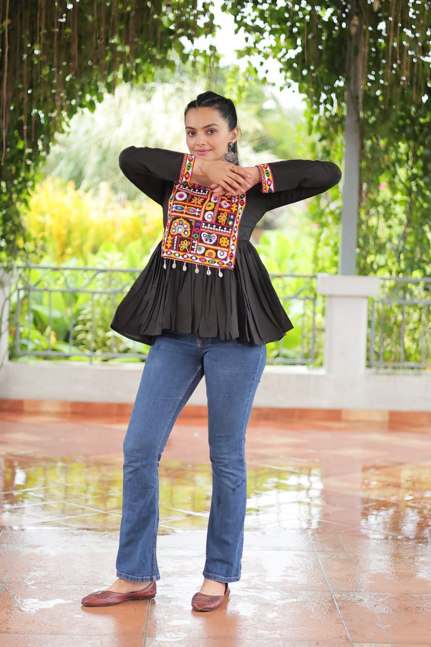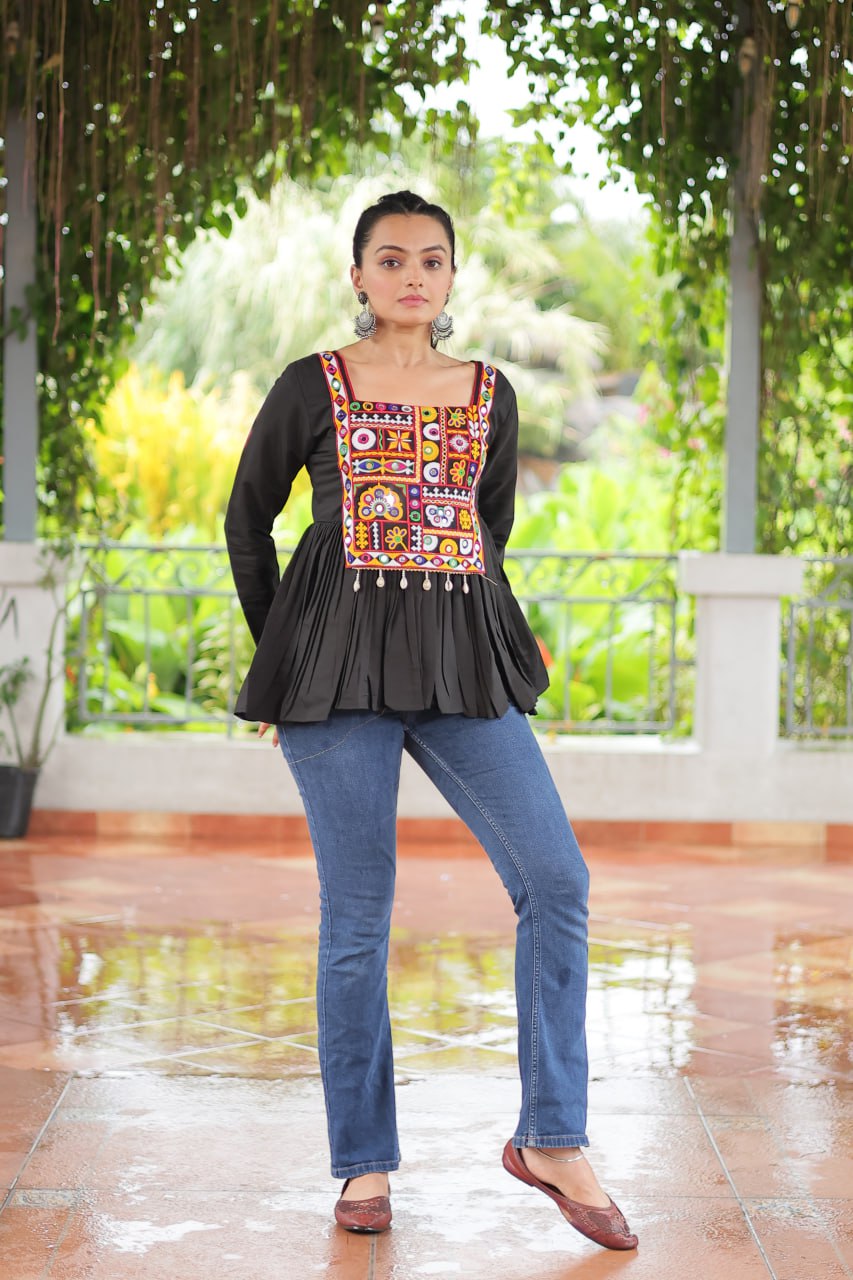 Black Color Roman Fabric Kutchi Gamthi Work Top